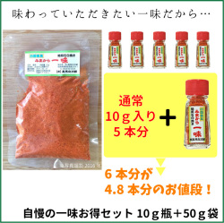 通常販売1瓶13g一味1瓶と業務用50g1袋をセットにしました。